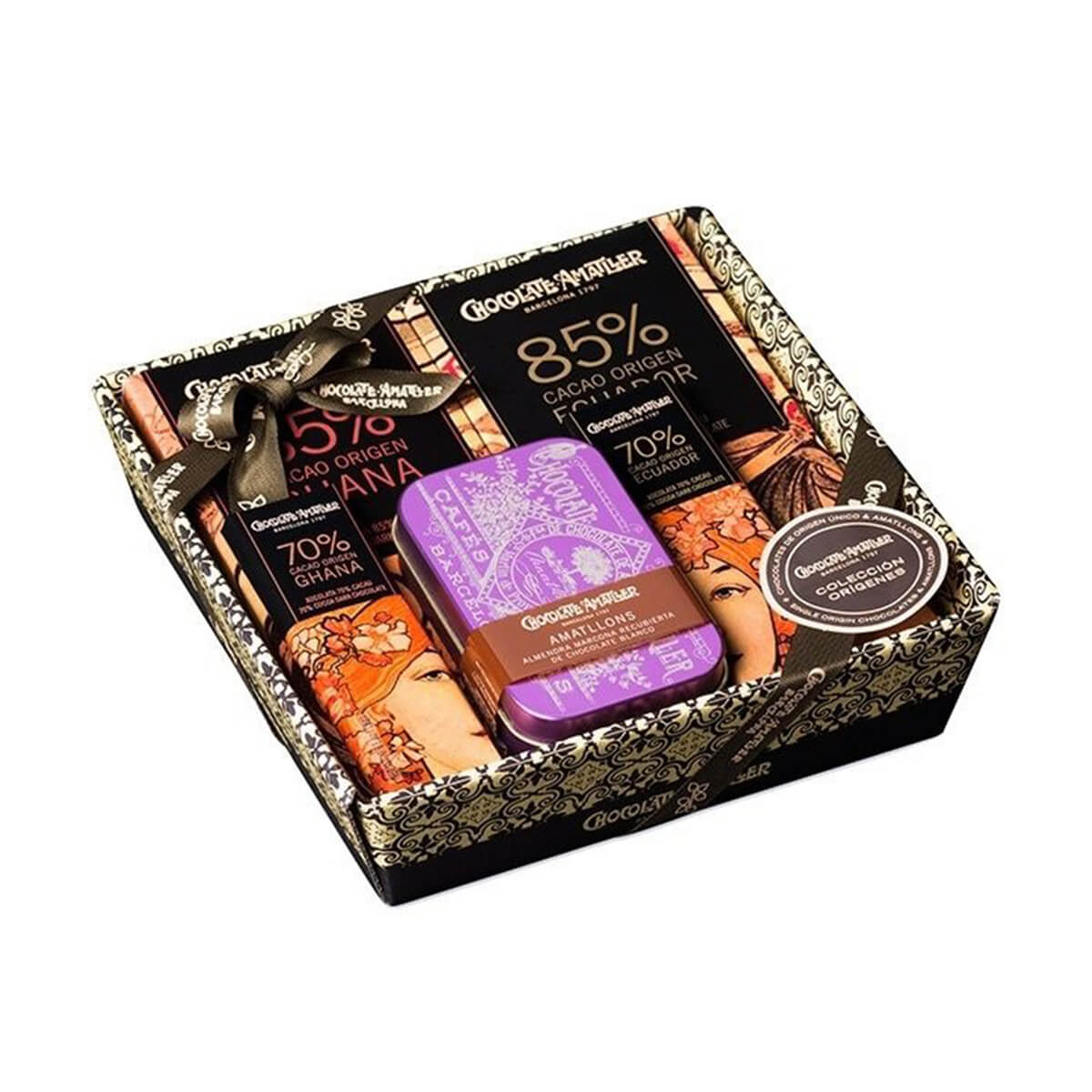 Набор из пяти лучших изделий Amatller, созданный специально для ценителей темного шоколада с насыщенным содержанием какао. В прозрачной упаковке, перевязанной атласной лентой.