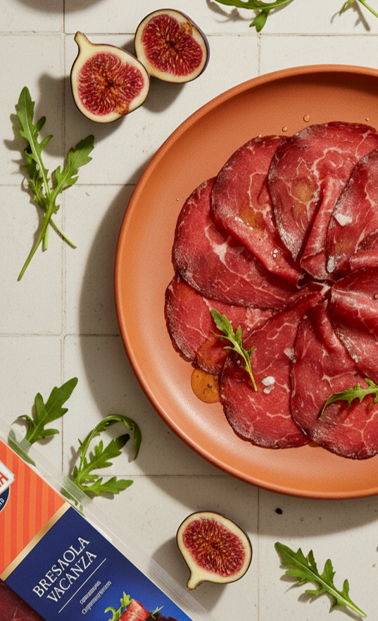 Bresaola Vacanza - тонко нарезанная говядина премиального качества, выдержанная по итальянской технологии. Деликатный вкус с лёгкой пикантностью чёрного перца и муската, бархатная текстура и аромат благородного мяса делают этот продукт идеальным выбором для утончённой закуски.