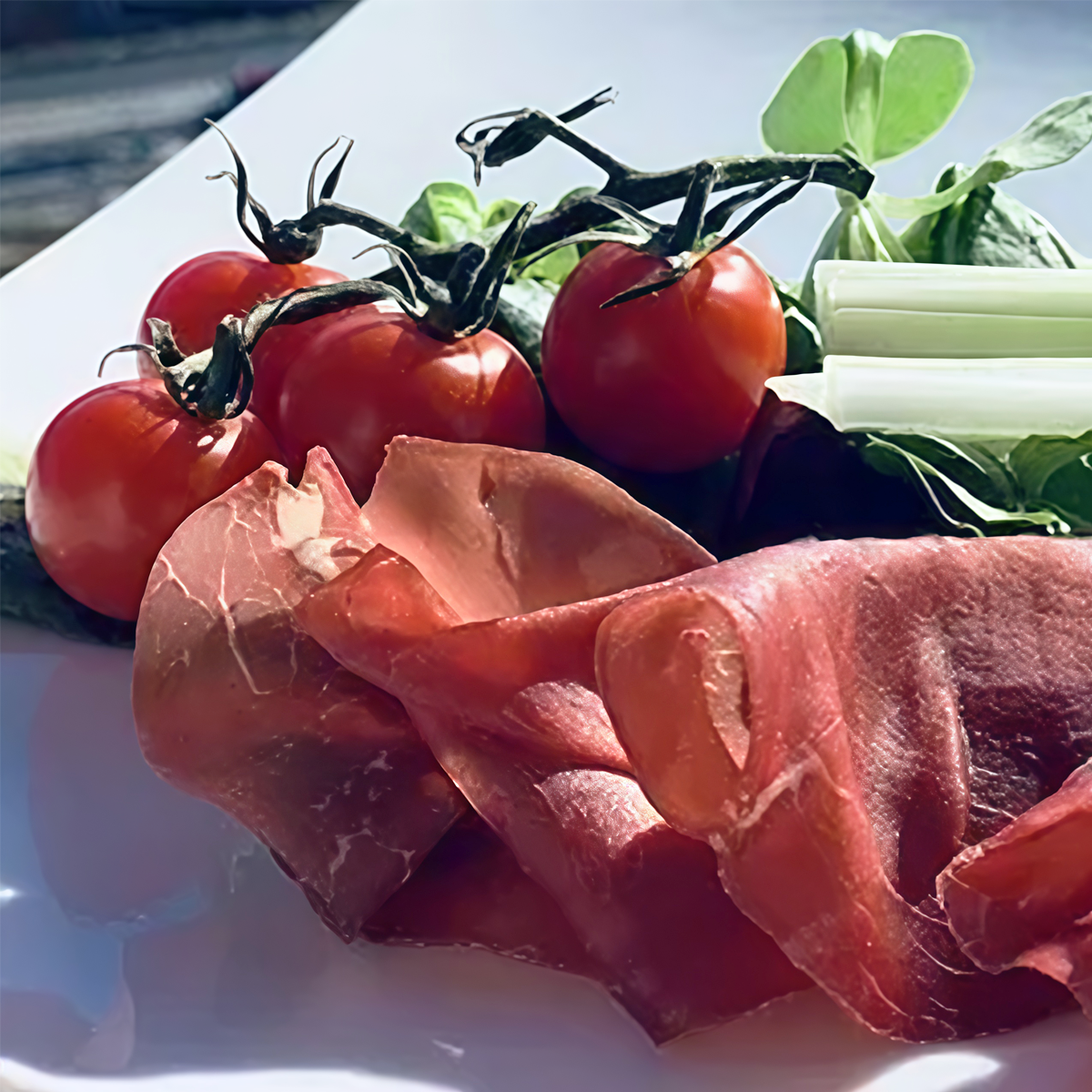 Говядина сыровяленая Брезаола - деликатес из соленой вяленой говядины, которая вызревает на протяжении двух месяцев, пока не станет твёрдой и не приобретет характерный темно - красный цвет. Обладает нежным вкусом и сладковатым терпким ароматом.
