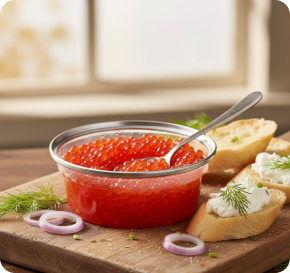Горбуша - наиболее распространенный представитель семейства лососевых, именно поэтому икра этой рыбы является самой популярной и привычной для большинства. Обладает поистине классическим вкусом, c легким оттенком горечи.