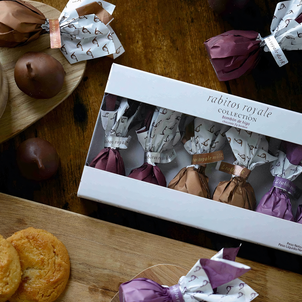 Инжир в шоколаде "Rabitos Royale" – это великолепное творение испанских кондитеров, которое подарит вам истинное наслаждение! Конфеты выполнены из отборного сухого сладкого инжира сорта Калабасита и покрыты тонким слоем шоколада. Начинка из трюфельного крема из белого или тёмного шоколада с различными дополнениями в виде Бренди, мусса из солёной карамели и крема ганаш с сушёной клубникой в сочетании со сладким инжиром - подарят вам истинное наслаждение!
