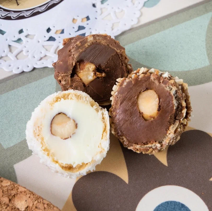 • Крем из сливок (сахарная пудра, растительный кокосовый жир, подсолнечное масло, какао-порошок обезжиренный, сывороточный протеиновый порошок, сухое обезжиренное молоко, ореховая паста, эмульгатор: соевый лецитин, ароматизаторы и антиоксидант: E-306), топпинг из растительного жира (сахарная пудра, растительный кокосовый жир и полностью гидрогенизированный подсолнечник, сывороточный порошок, обезжиренный какао-порошок, эмульгатор: соевый лецитин и ароматизаторы), вафля (пшеничная мука, кукурузный крахмал, эмульгатор: соевый лецитин, пшеничное волокно, какао и газифицирующий агент: бикарбонат натрия), фундук (6%) и карамелизированный дробленый миндаль (2%) (сахар и миндаль). В нем могут содержаться другие фрукты, яйца и горчица.