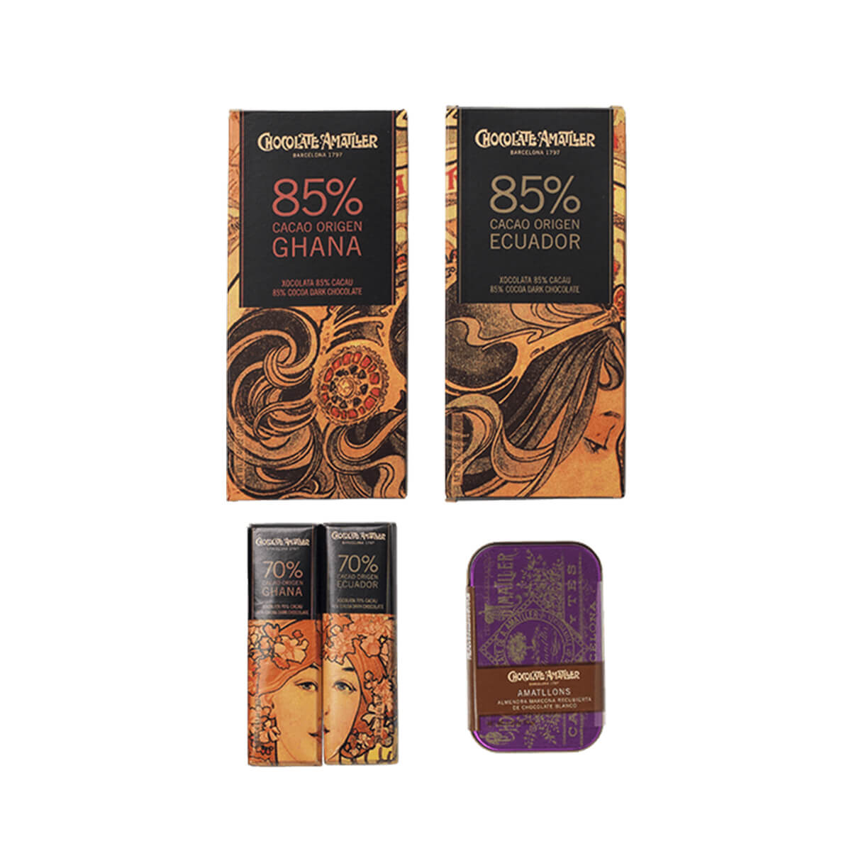 Набор из пяти лучших изделий Amatller, созданный специально для ценителей темного шоколада с насыщенным содержанием какао. В прозрачной упаковке, перевязанной атласной лентой.