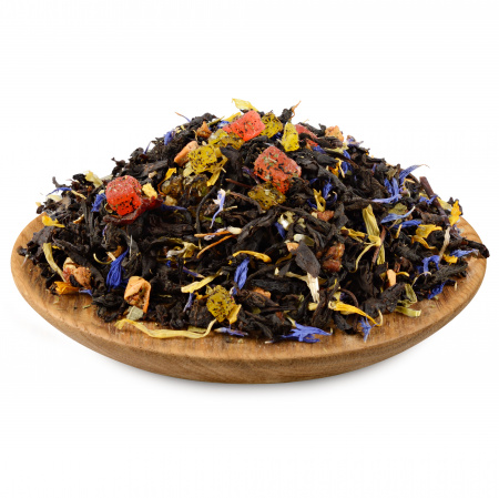 Черный чай «Брызги Шампанского» — это настоящий шедевр, сочетающий в себе премиальный купаж отборных чайных листьев с плантации Ассам и восхитительный букет сушеных ягод клубники, кусочков яблока и груши, долек апельсина, а также нежных лепестков бирюзового василька и белой хризантемы.