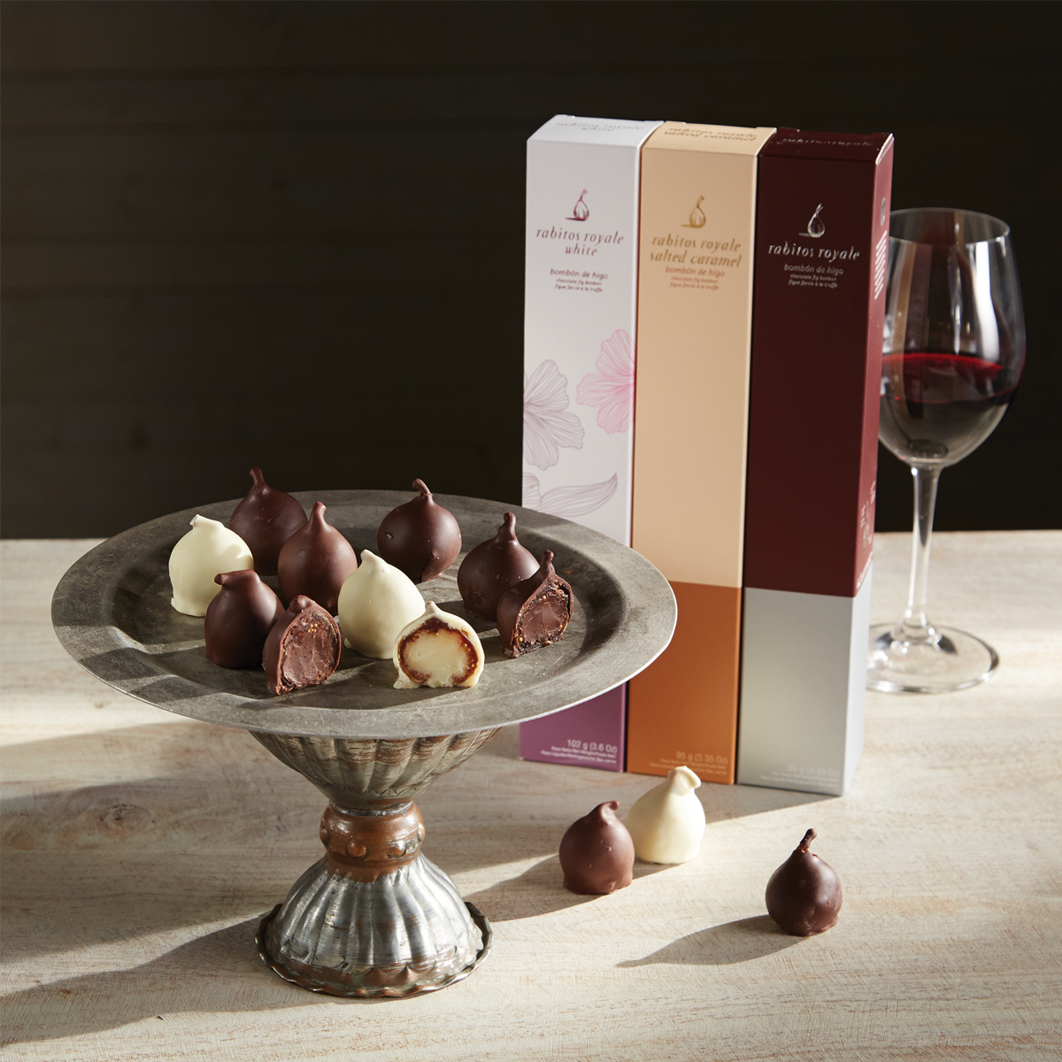 Конфеты Rabitos Royale " Ассорти три вкуса ", изготовленные из специально отобранного сухого инжира сорта Калабасита, наполненные восхитительным трюфельным кремом с добавлением бренди и покрытые тонким слоем шоколада. Натуральный тёмный шоколад и крем ганаш с оттенком бренди приятно акцентирует тонкую сладость инжира. Инжир в молочном шоколаде наполнен муссом из молочного шоколада с солёной карамелью. Инжир в белом шоколаде - самый сладкий из всей линейки, наполнен трюфельным кремом на базе белого шоколада с сушёной клубникой.