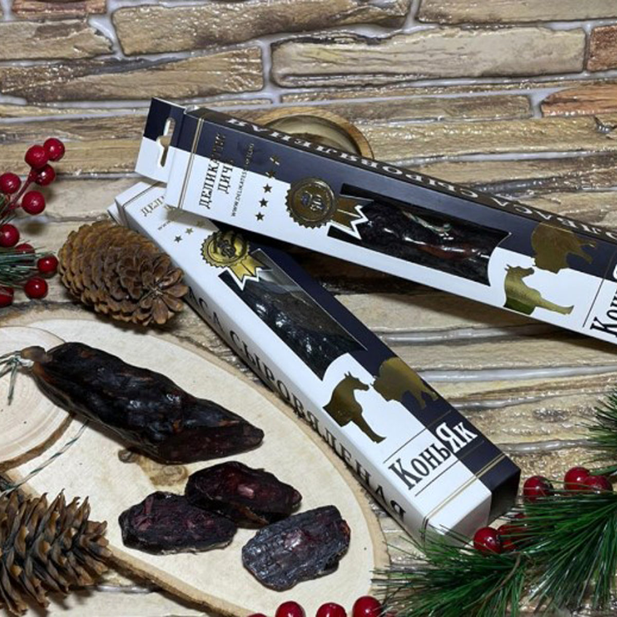 Колбаса сыровяленая КоньЯк в подарочной упаковке из конины и хайнака, 200г Деликатес Дичь