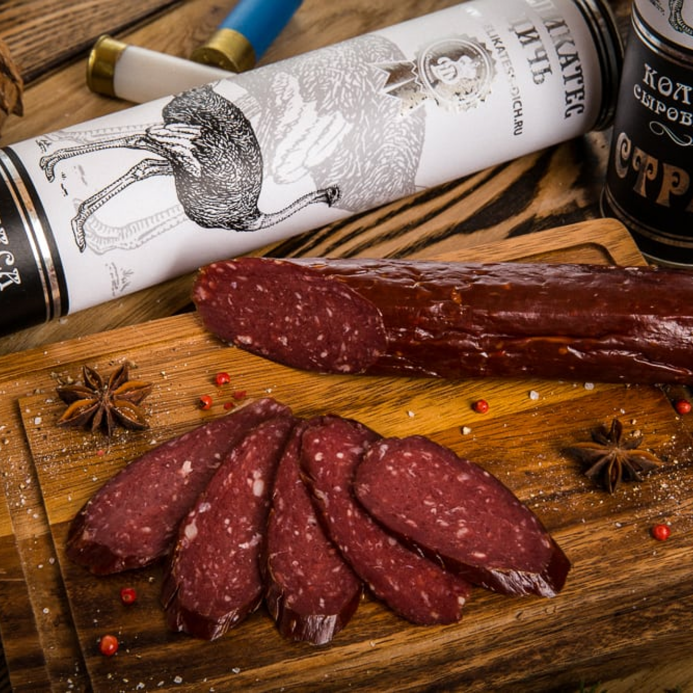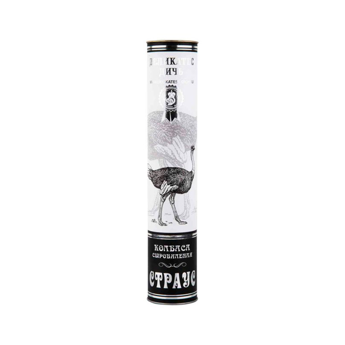 Сырокопченная колбаса из мяса Страуса от Деликатес Дичь. Выпускается российским производителем. Натуральные компоненты, потрясающий вкус и аромат – основные качества сырокопченого деликатеса, который украсит ваш стол и подарит минуты блаженства. Упакована колбаса в подарочный тубус.