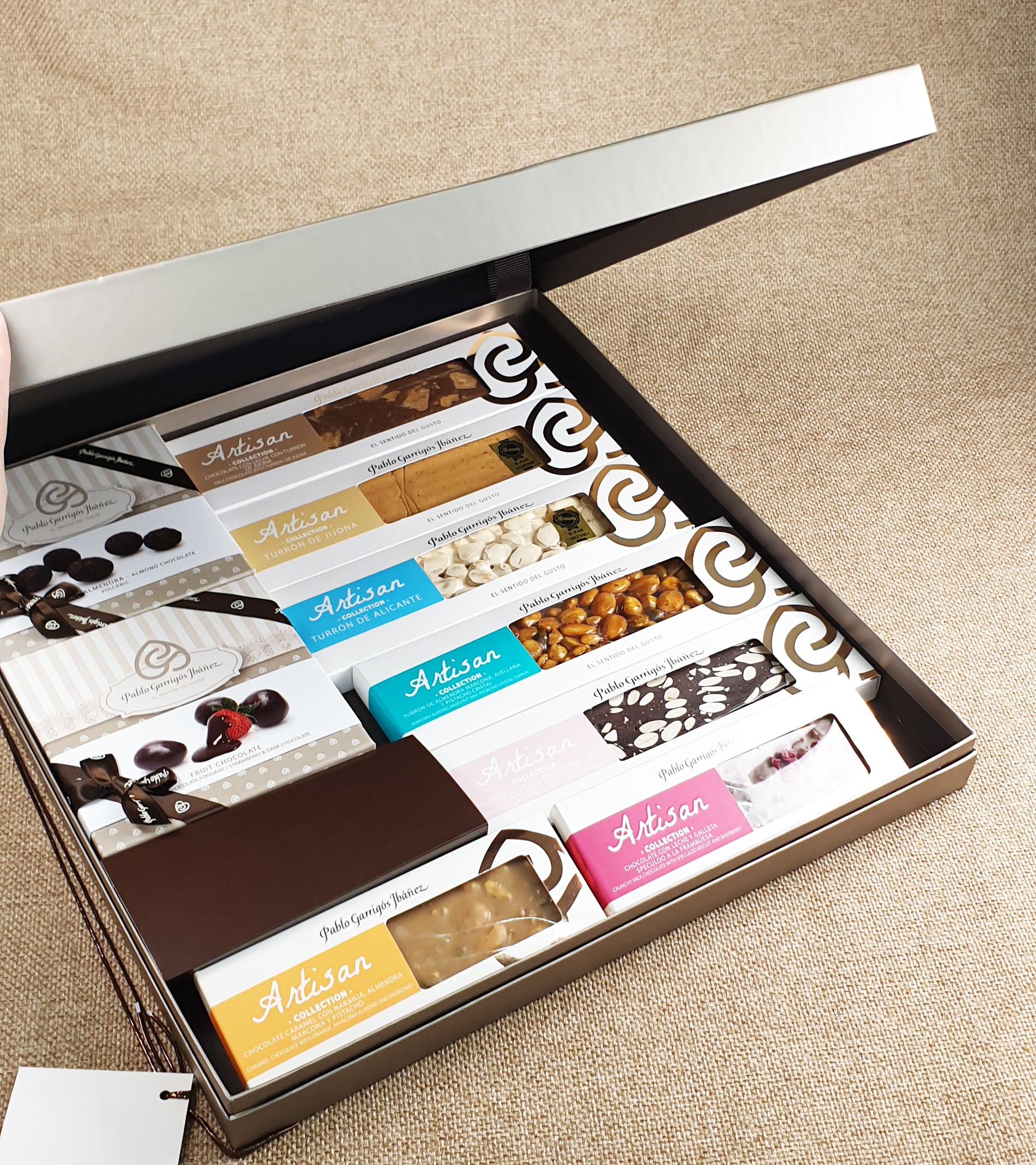 Подарочный набор из лучших турронов фабрики Pablo Garrigos сериии Artisan collection и Vintage. В составе набора 9 позиций - миндаль Маркона в шоколаде и обсыпке, малина в белом и тёмном шоколаде, твёрдый туррон Кристалл из миндаля Маркона с карамелью, шоколадный туррон из тёмного шоколада с миндалём Маркона (более 40%), шоколад с турроном из Хихоны, мягкий туррон из Хихоны, карамельный шоколад с апельсиновыми цукатами, фисташками и миндаль Маркона, твёрдый туррон из Аликанте, шоколад с малиновыми хлопьями. Это прекрасный набор для самых взыскательных любителей сладостей. Испанские турроны Пабло Гарригос, изготовленные по старинным рецептам, производят огромное впечатление даже на тех, кто отлично знает эти испанские сладости.