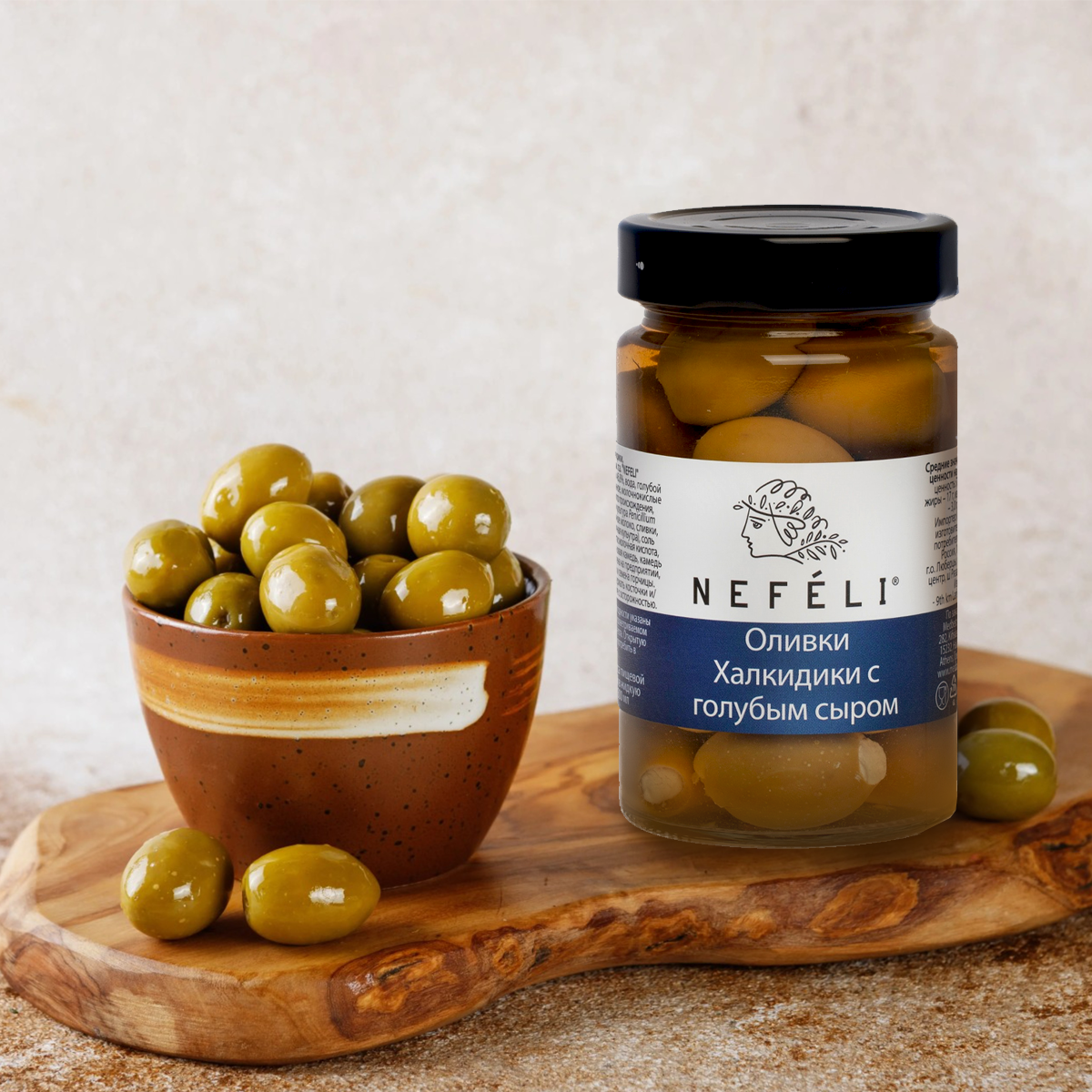 Оливки Халкидики с голубым сыром NEFELI, 300 г (Греция)
