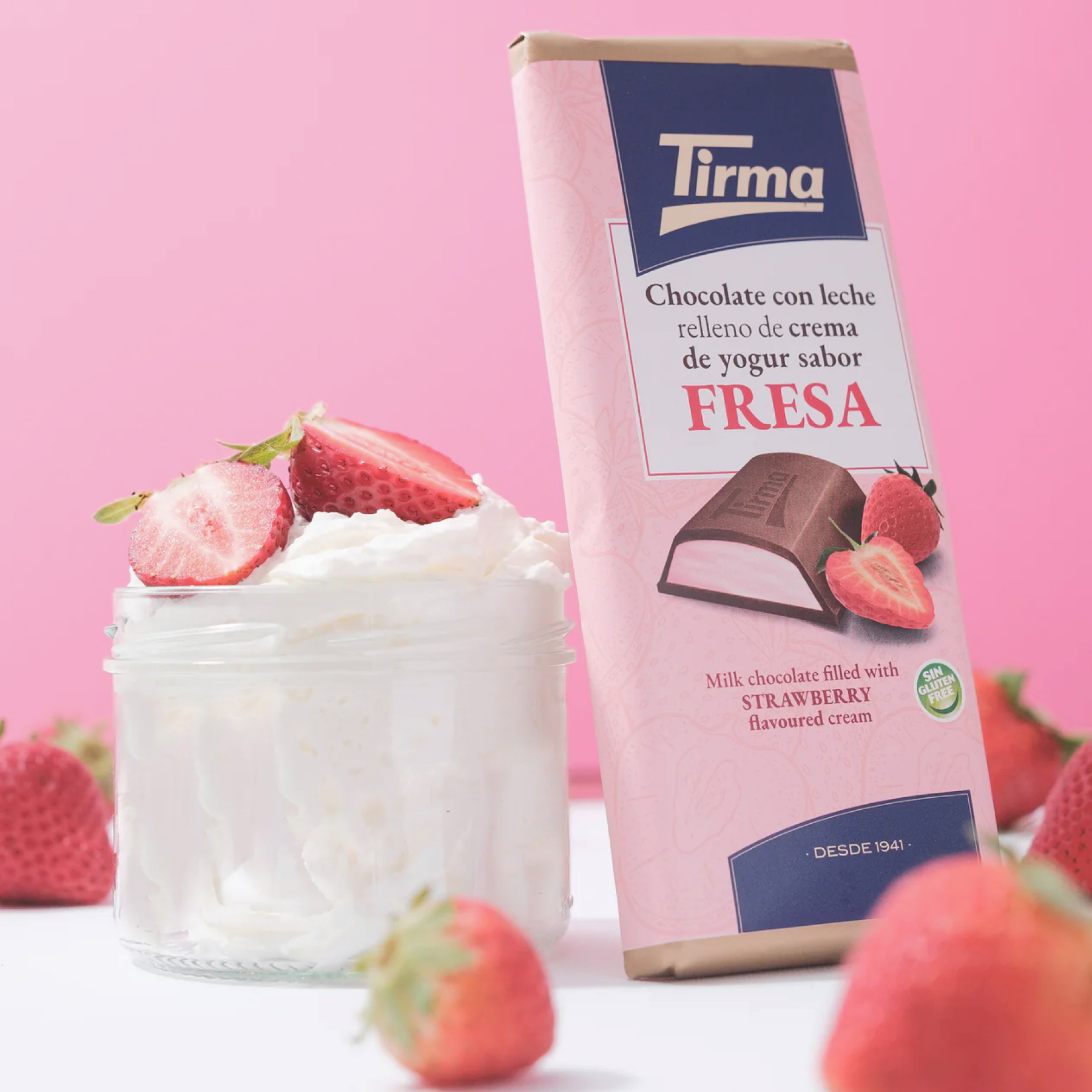 Молочный шоколад Tirma с начинкой из клубничного йогуртового крема, предлагающий уникальное сочетание текстур и вкусов.