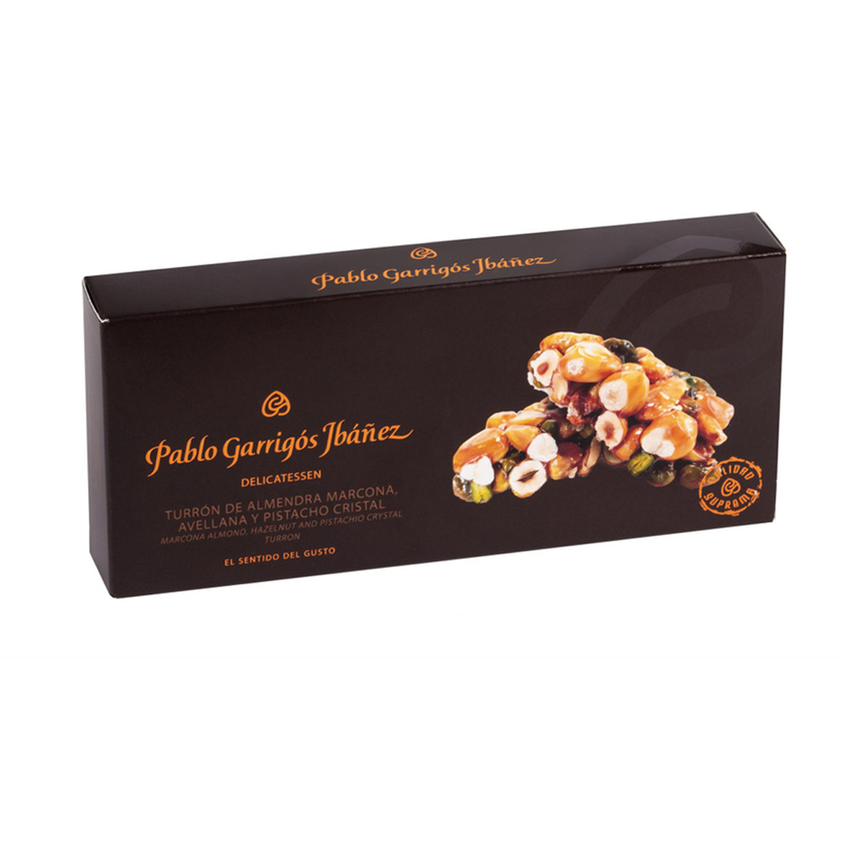 Туррон с миндалём, фундуком и фисташками - это твёрдый туррон грильяжного типа. Орехи заливаются карамелью на основе тросникового сахара и розмаринового мёда (16%).