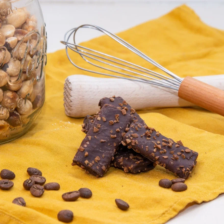 Мы добавили к нашим вафельным десертам в молочном шоколаде с кофейным вкусом посыпку из кофейной крошки. Искушение, которому трудно противостоять.